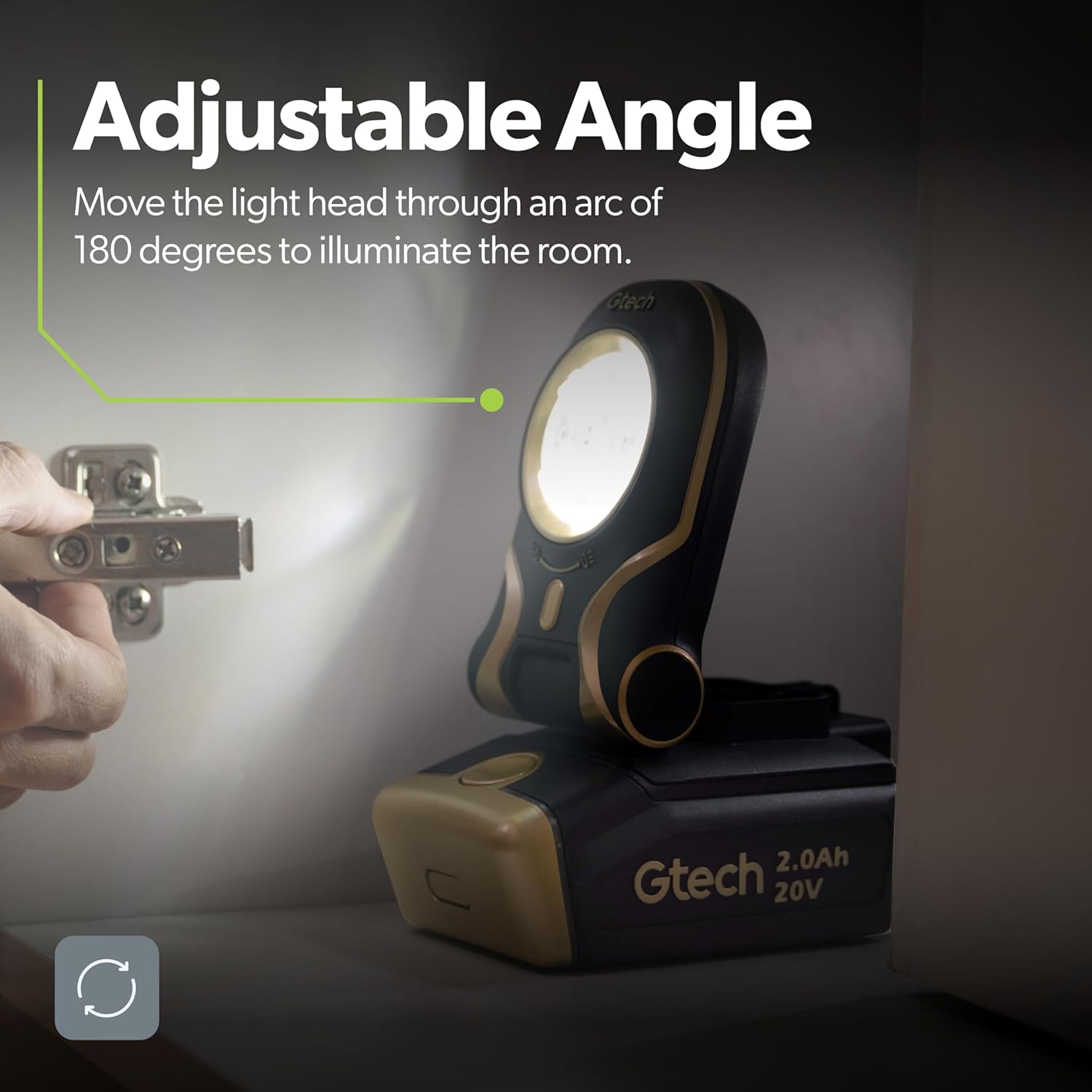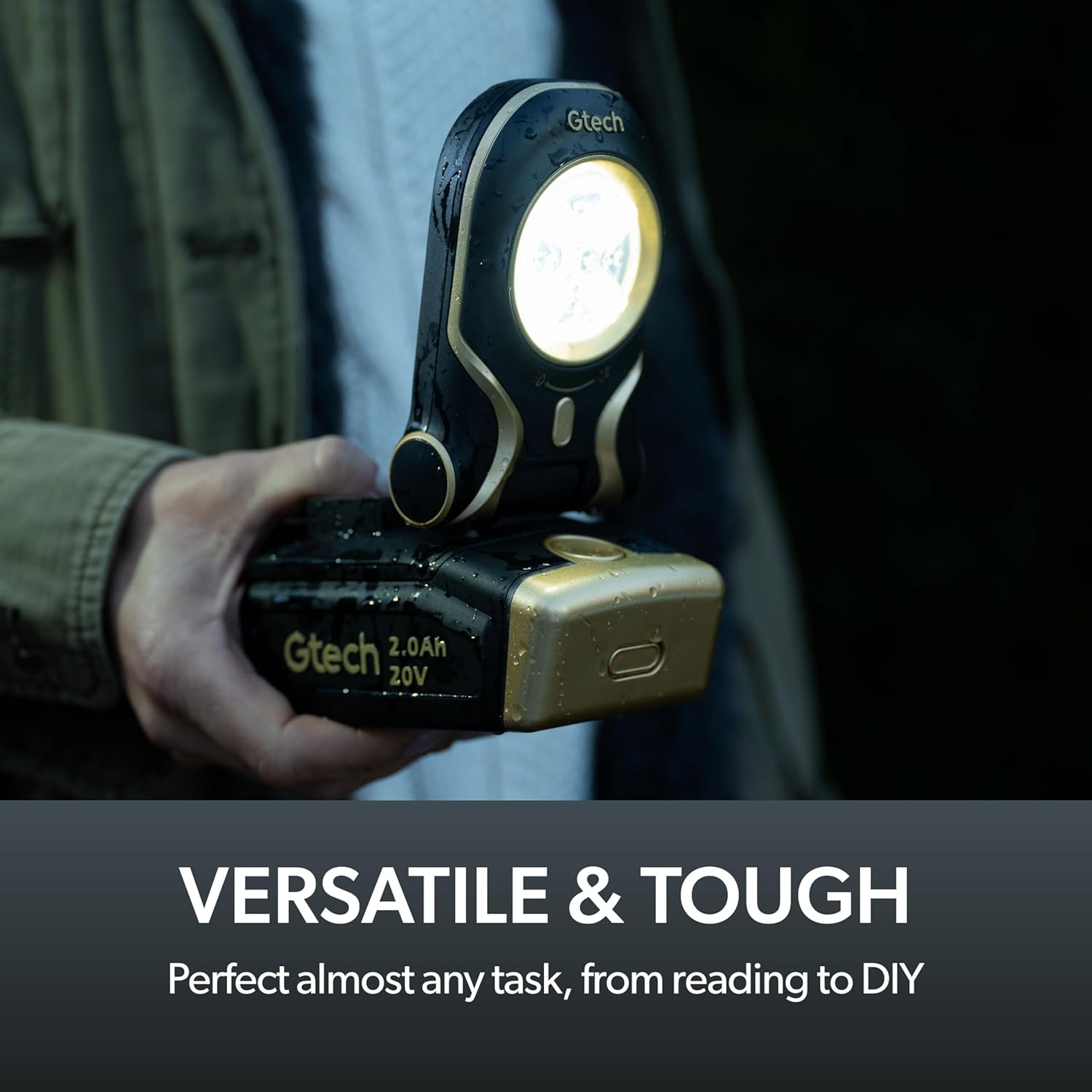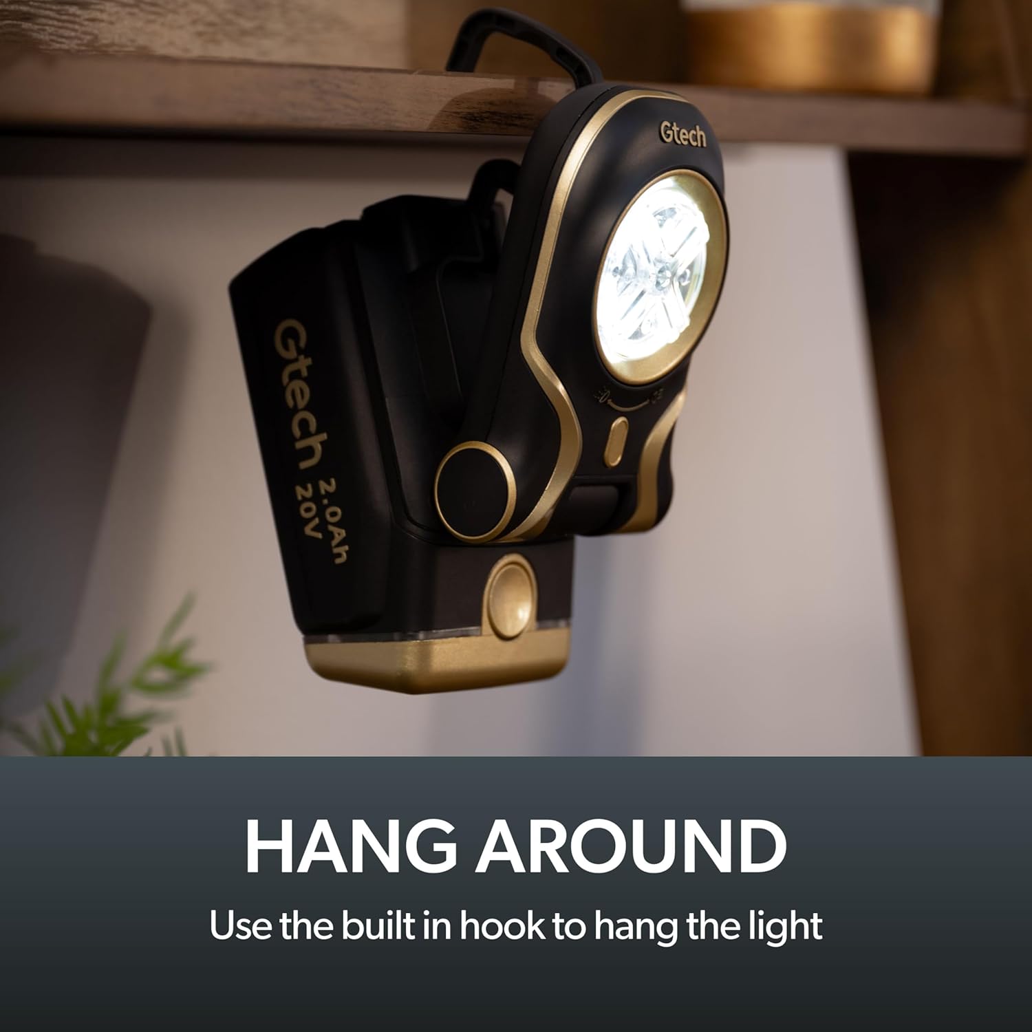 Gtech's powerful and compact Task Light. Advanced lithium-ion LED technology, 2 beam options and 2 brightness settings. Adjustable through 180 degrees. Magnetic clamp and hanging hook for hands-free illumination. Universal 20V battery (battery and charger not included).