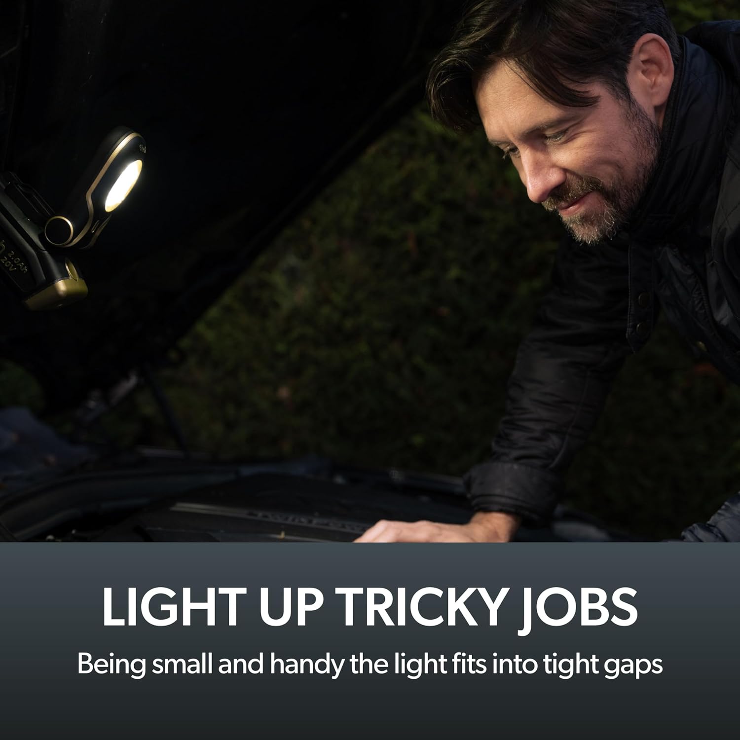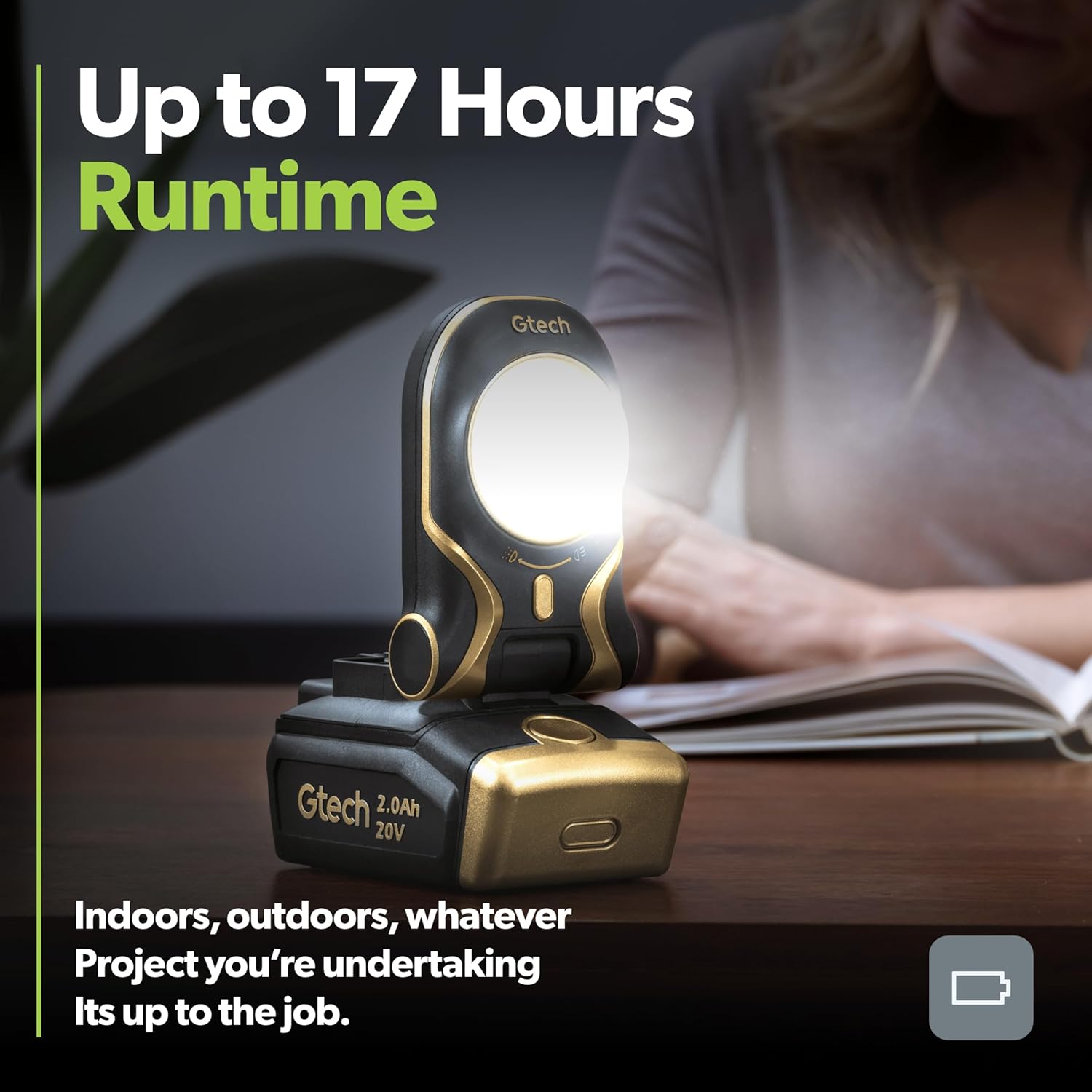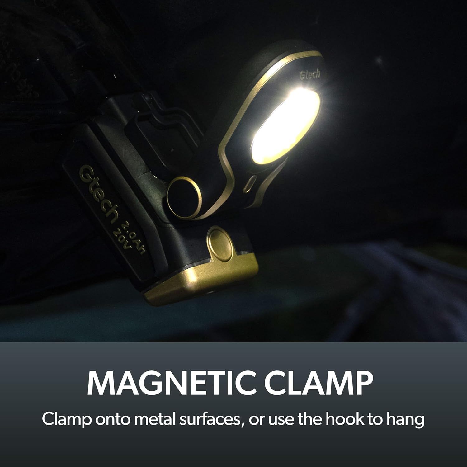 Gtech's powerful and compact Task Light. Advanced lithium-ion LED technology, 2 beam options and 2 brightness settings. Adjustable through 180 degrees. Magnetic clamp and hanging hook for hands-free illumination. Universal 20V battery (battery and charger not included).